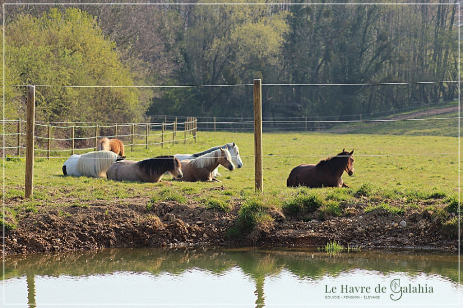 L'aire stabilisée est ouverte sur une équi-piste autour de laquelle les chevaux ont accès à des parcelles en herbe où le pâturage au fil permet de réguler leur alimentation en fonction de leurs besoins. L'équi-piste favorise leurs mouvements et les stimule afin de maintenir un bon équilibre physique et mental, autant pour le cheval en activité que retraité. Votre cheval pourra savourer les plaisir de grands galops entre copains.