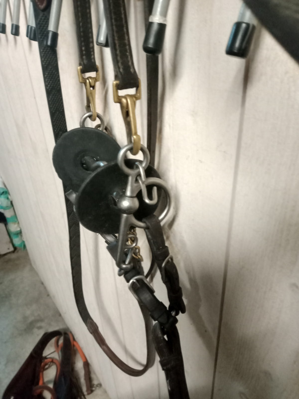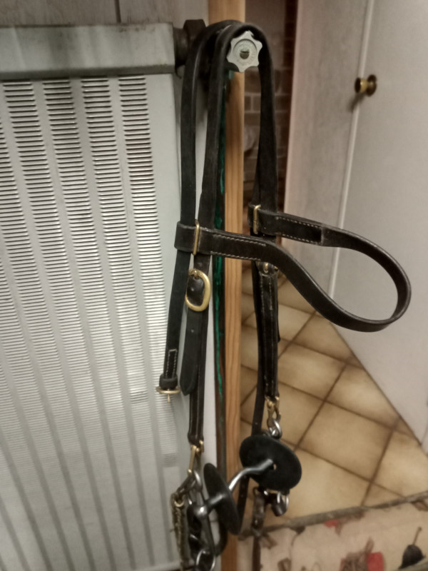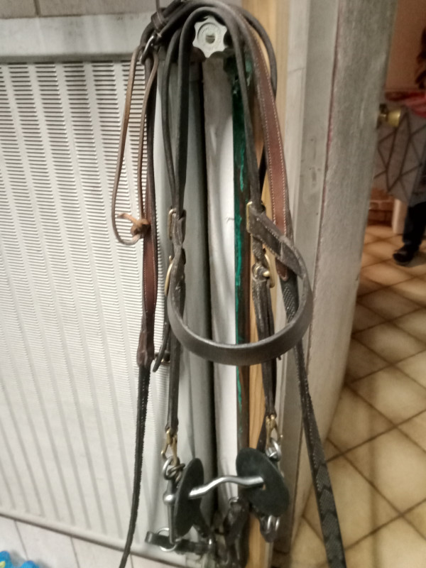 filet complet cuir avec renes caoutchouc, alliances cuir, mors pelham. a venir chercher sur secteur, pas d'envoi postal. paiement en especes