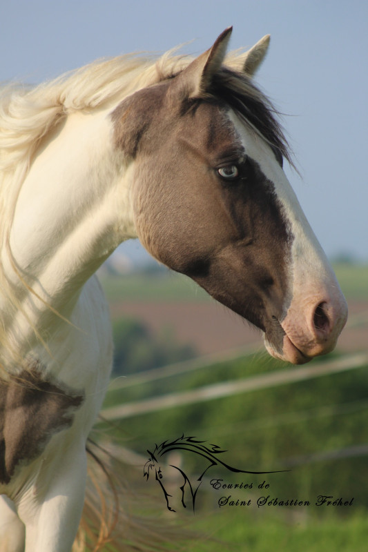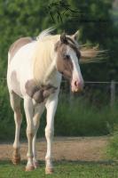 Les Ecuries de Saint Sébastien vous proposent Milky Mouse Primrose, une jeune jument paint horse prenant 3 ans cette année. Milky est de robe grullo tobiano aux yeux bleus, double homozygote pour les gènes noir et dun, LWO négatif. Elle a une très belle teinte de grullo assez clair, laissant se démarquer sa raie de mulet et ses marques primitives. Elle est très proche de l'homme (trop, c'est un véritable pot de colle difficile à photographier, à part si vous aimez les gros plans!) et bien manipulée, elle connaît tout ce qu'un jeune cheval doit connaître: marche en main, attache, voyage en van, elle est facile à aborder et licoler, couverture, petites balades en main, elle est sage avec le maréchal ferrant et le vétérinaire... Milky est très sereine face à son environnement, pas peureuse. Parfaitement sociabilisée elle vit en troupeau en extérieur à l'année. Elle toise actuellement 1m45, et va sûrement prendre encore quelques cm.