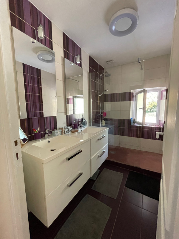 La maison de 173 m2 est composée de 4 ch, 1 salle de bain avec baignoire balnéo, 1 salle d'eau avec douche italienne, 1pièce de vie de 50 m2 avec cheminée insert, 1 cuisine équipée séparée, 1 mezzanine faisant office de bureau, 1 chaufferie avec une chaudière à pellets