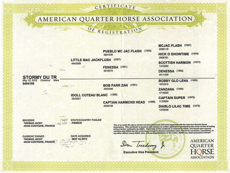 Stormy à déjà fait des concours de VRH, elle est très bien montée, elle connait les man?uvres de l?équitation américaine, a déjà fait 5 poulains, elle est pleine de Memphis du TR (étalon du Ranch) mise bas prévue en mars.