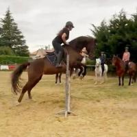 Bacoumba de Riverland de l'élevage de Riverland a Aloué (Charente), 14 ans, jument Selle Français Baie 1m66. Ferrure classique aux antérieurs. Vit actuellement au pré mais a connu le boxe la nuit. Caractère type d'un jeune cheval. Part seul en ballade, en groupe cheval de tête n'aimant pas être a l'arrière.
