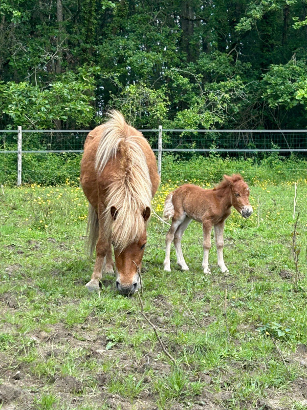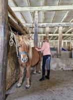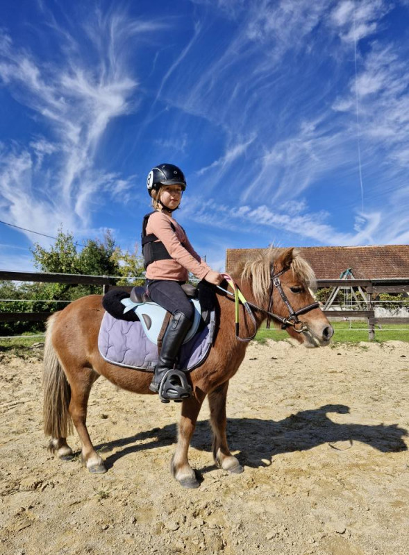 Kaline a été débourré jeune puis mise à la reproduction. C'est une super maman ! Le travail monté a été repris, c?est une très gentille ponette qui peut ne pas être montée pendant plusieurs semaines sans incidence sur son comportement. Kaline a fait des baptêmes poneys tenue en main chez nous ou elle s?est très bien comportée. Elle sera extra également en tant que ponette de spectacle (grande capacité d'apprentissage avec des carottes à la clé) et peut aussi être utilisée poulinière de part sa jolie morphologie (photo d'un de ses poulains sur demande).
