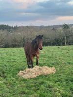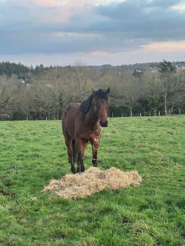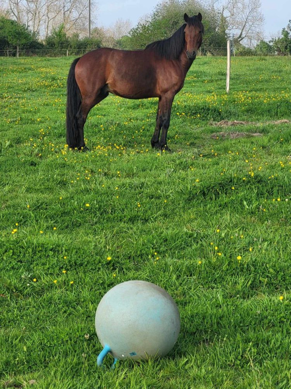 En pâture, il est joueur, calme et respectueux des clôtures. Il vient poser sa tête dans le licol tout seul.