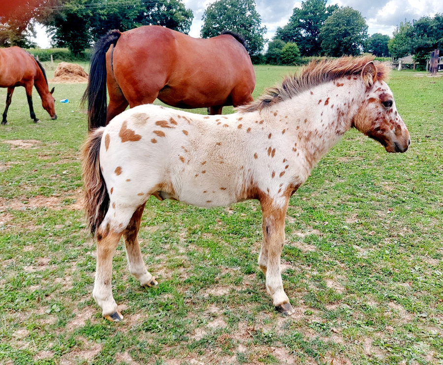 Poulain mâle OC né mai 2025, robe appaloosa (× bai ou isabelle ?),