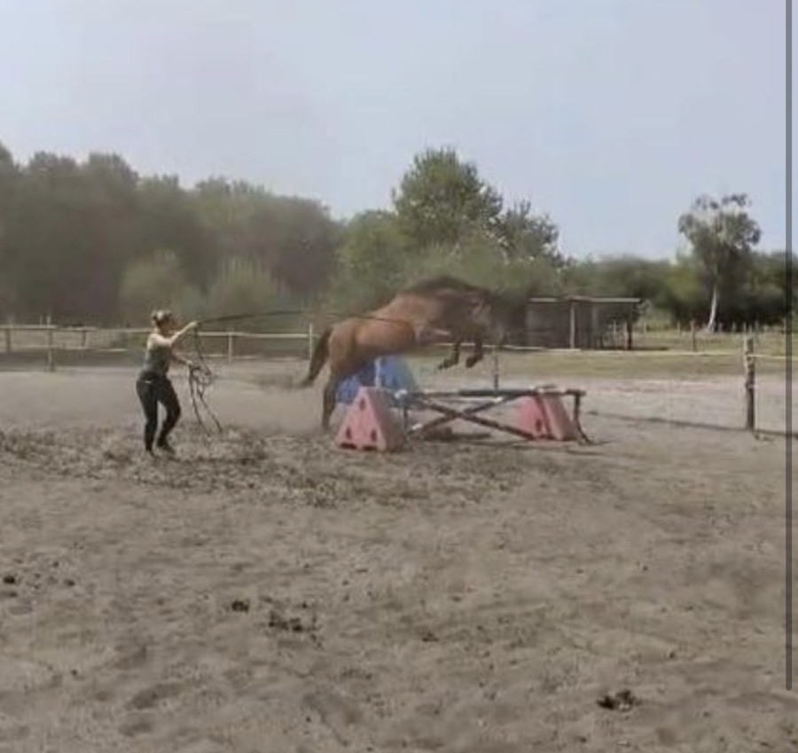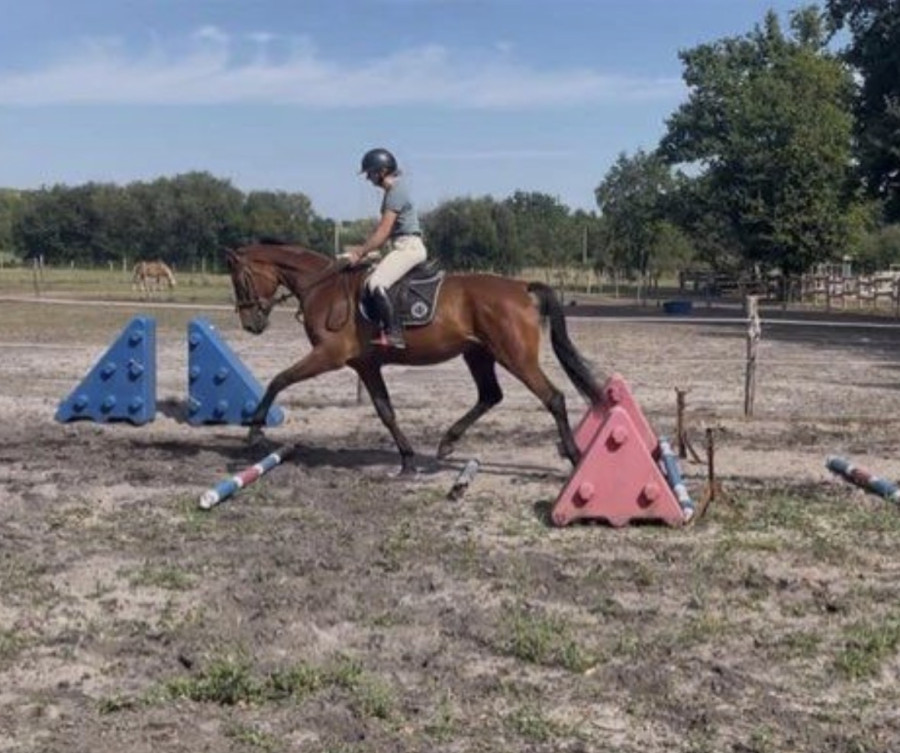 Très gentil cheval qui vit au pré à l?année. Reformé récemment , il travaille monté au pas et au trot. Commence à galoper. Il travaille très bien sur le plat, enchaîne un parcours de barre au sol. Il travaille aussi en longe et à pied. Joli petit coup de saut