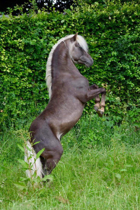 Il toisera entre 1m05 et 1m10 cm, ce qui en fera un poney idéal pour la monte pour les enfants ou pour l'attelage ou même pour du travail à pied pour les adultes.
