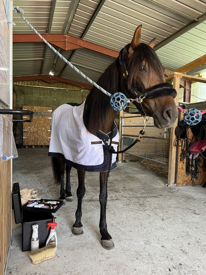 Cheval avec juste ce qu’il faut de sang, aucun vice, pratique l’obstacle, plat, travail à pied, balades et séances de gratouilles, pour cavalier Galop 4/5