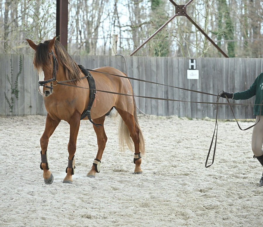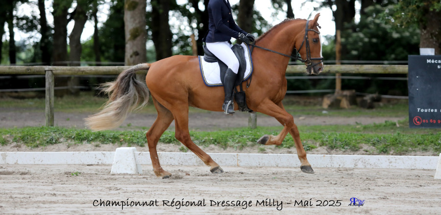 .Dressage (trois allures très confortables. Cessions à la jambe, appuyers, épaule en dedans, tête au mur, contre galop. Cheval fin, réactif, avec un bon équilibre)