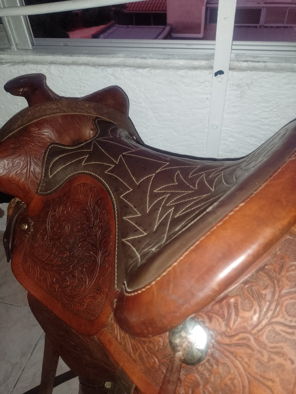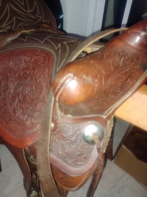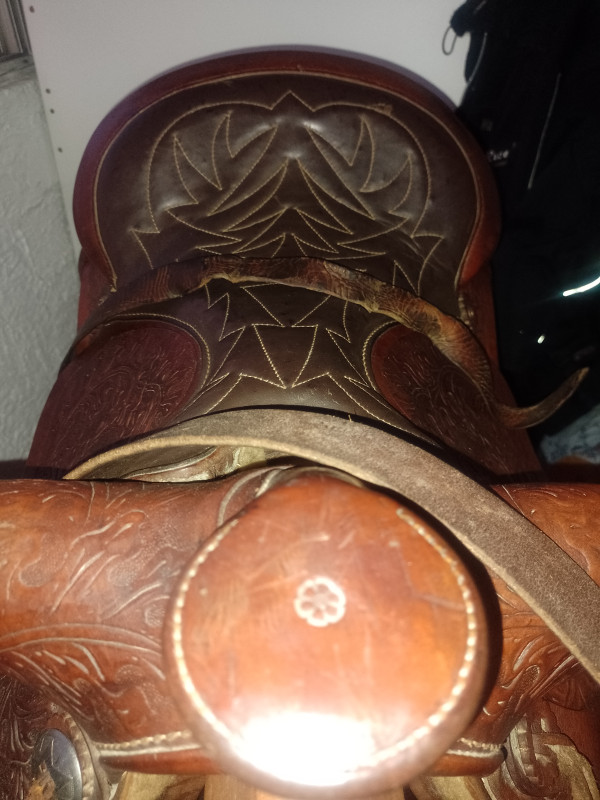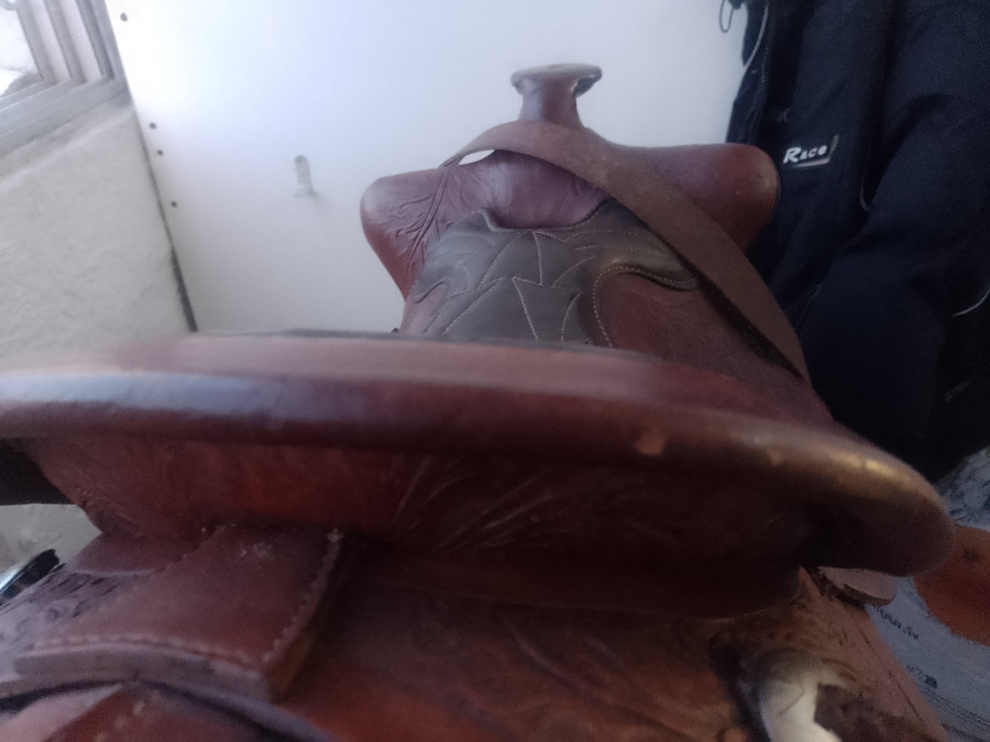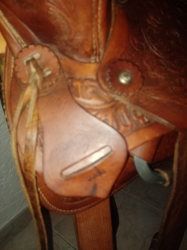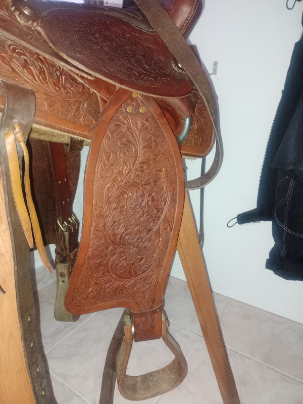 Bonjour, je mets en vente une selle western Simco 7700 en cuir très propre le cuir est entretenu quelques accros sur le rebord du dosseret les étriers sont en bois