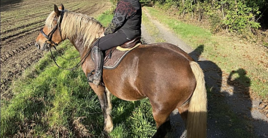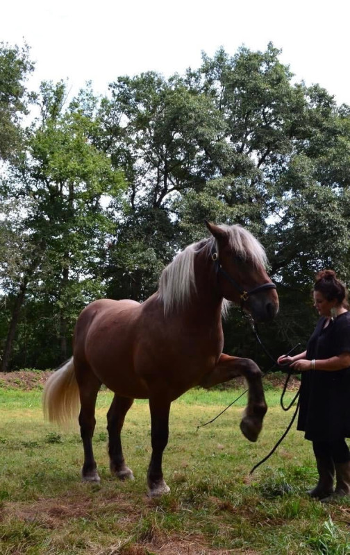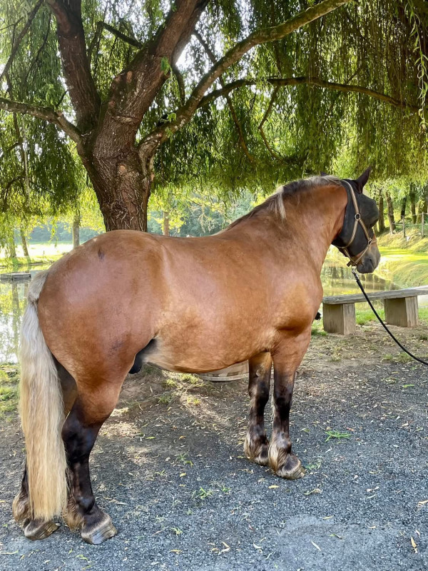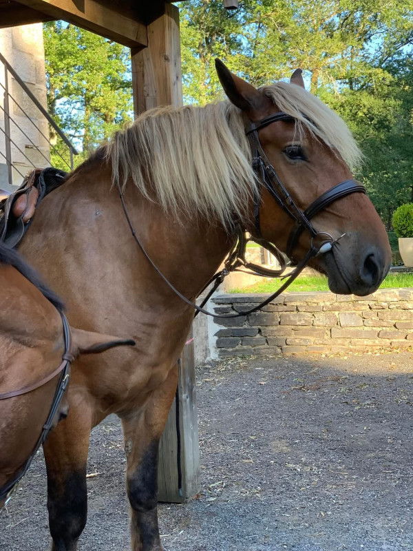 Je vends à contre coeur mon comtois de trois ans. Il est débourre à la selle. Il est froid dans sa tête. Sort seul en ballade. Écoute à la voix : arrêt, marcher, reculer, trotter.