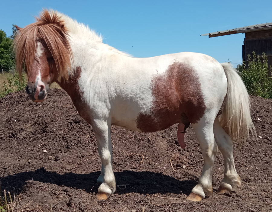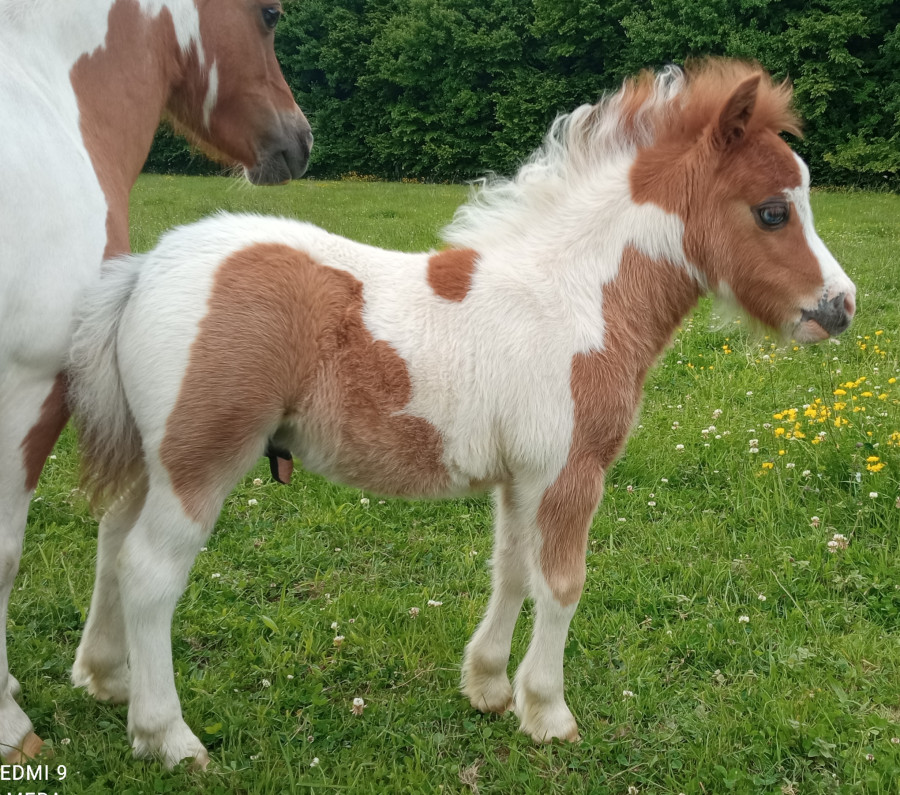 Poulain miniature américain, plein papier AMHA, tests génétiques réalisés. Il vient d'être sevré. Leur père est né au Canada (Countrylanes Magic Adonis, alezan pie, 32 inches)
