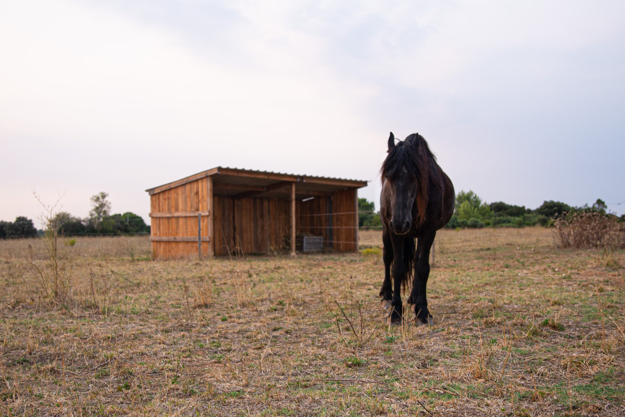 - un hectare de pré incluant un abri extérieur de 28m², à partager avec au maximum deux autres compagnons + un boxe de 14m² en écurie en cas de nécessité (sécheresse, froid intense, repos forcé, maladie...). Tarif : 250€ pendant un an, puis 300euros.