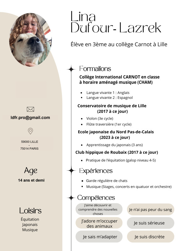 Elle est au collège Carnot à Lille, fait du violon, de la flûte traversière, apprend le japonais depuis 3 ans. Son CV est en PJ avec un email de contact, ou via le site CA.