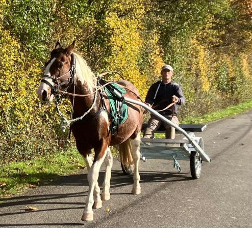 il est attelé a une dresseuse afin de lui faire avoir la condition physique pour être monté dans le futur