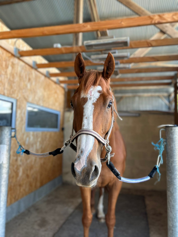 Il est très gentil en salle de soin, part en balade, voyage bien, gentil avec le maréchal. Il vit aussi bien en box qu'au prés.