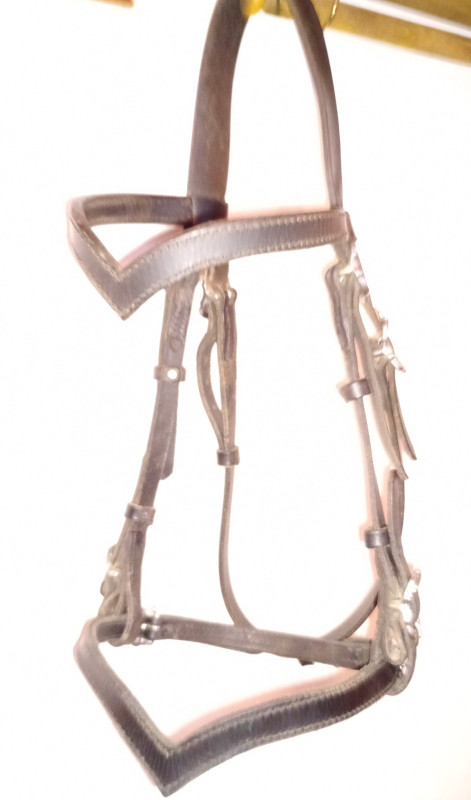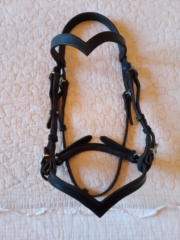 Bridon portugais taille cheval en cuir noir très souple, fa briqué par sellerie Phoenix.