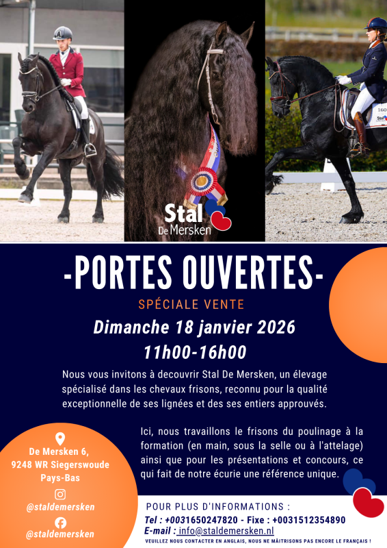 Nous organisons une journée portes ouvertes chez Stal de Mersken (Pays-Bas, Friesland), élevage reconnu pour ses lignées frisonnes de haut niveau et ses entiers de studbook.