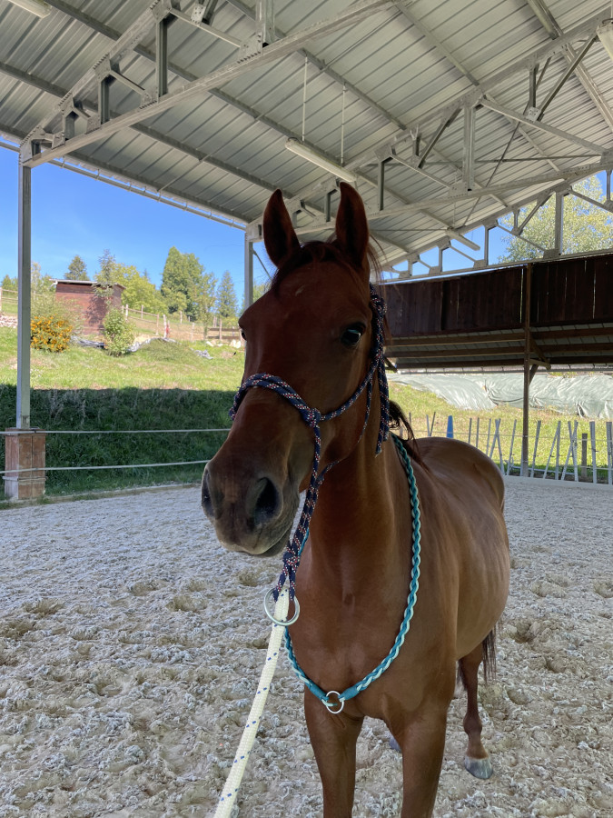 Haslan est un petit cheval très proche de l’homme et gentil, sans aucuns vices. Débourré à 4 ans, il a appris très vite et s’est toujours montré volontaire et généreux au travail. C’est un cheval polyvalent, on a toujours touché à tout : obstacles ( 1 toute petite saison de concours à ses 5 ans qui a été très enrichissante), dressage (des allures vraiment confortables pour un DSA !) , travail à pied (un vrai petit clown, désensibilisé +++), balade (un peu sur l’œil mais part seul sans soucis, il faut juste respecter son rythme, il regarde et veut comprendre son environnement), longe, liberté …