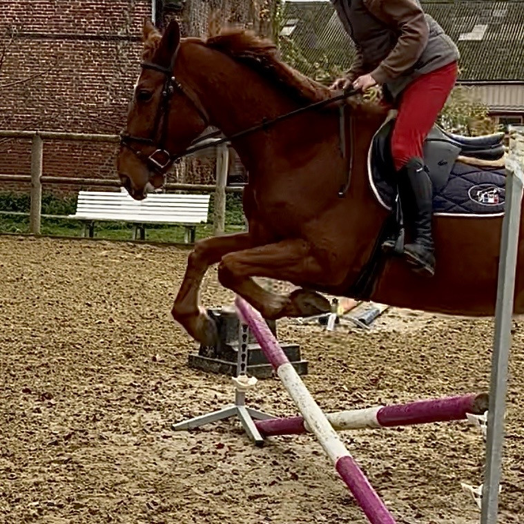 Jument appliquée, avec une excellente capacité d’apprentissage, elle a déjà sauté des barres montée.