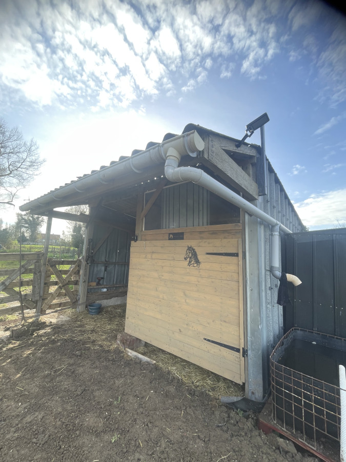 Pension en pré 24h/24 avec un grand abri paillé, nettoyé quotidiennement, équipé d'un râtelier à foin.