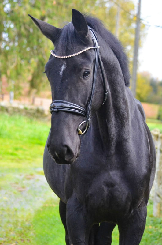 Nous vous présentons Irine MH de Jeu, une magnifique jument Oldenbourg noire de 3 ans et demi, déjà très élégante et affichant un potentiel certain pour le dressage moderne.