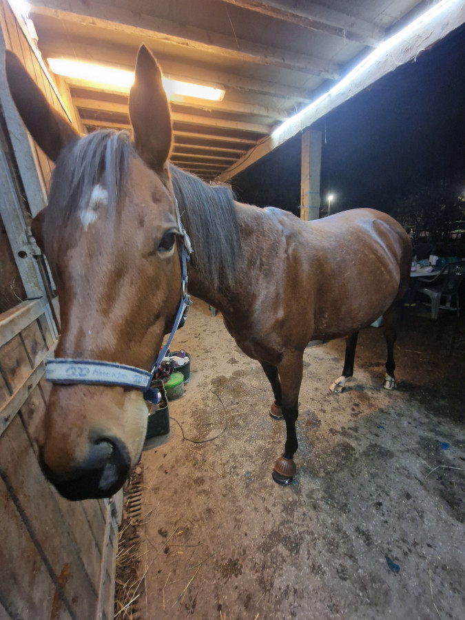 Elle ne convient pas à un cavalier débutant, car c'est une jument de 5 ans qu'il faut continuer de former. Mais adorable et très gentille.
