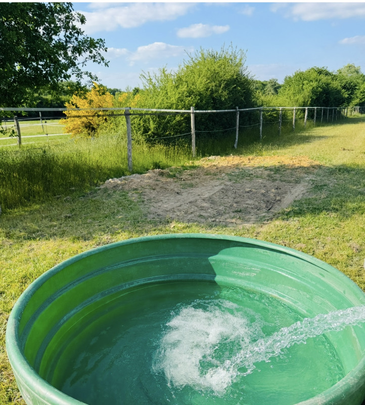 Eau de la ville. Abreuvoir 1000L vidé et nettoyé 1x par mois.