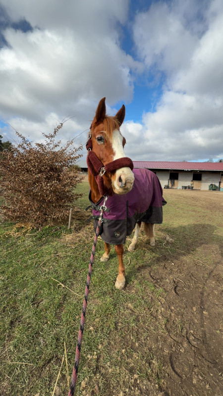 Vie au pré à l’année, couverte avec une imper l’hiver, jamais tondu.