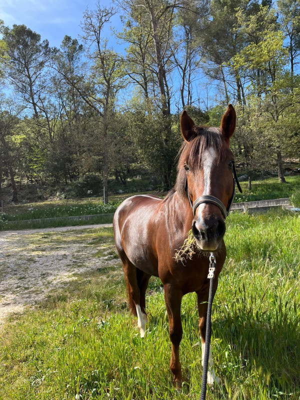 A jour vaccins, dentiste, ostéo, jamais de blessure depuis sa naissance, robuste, avec une ferrure simple aux antérieurs.