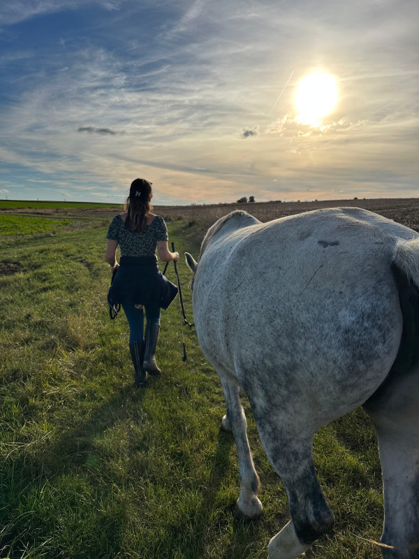 Les balades en main sont possibles, et le travail ainsi que les balades montées pourront être envisagés par la suite, une fois la relation bien établie. Csenge sort seule comme accompagnée (elle ne se laisse pas facilement impressionner et reste sereine).