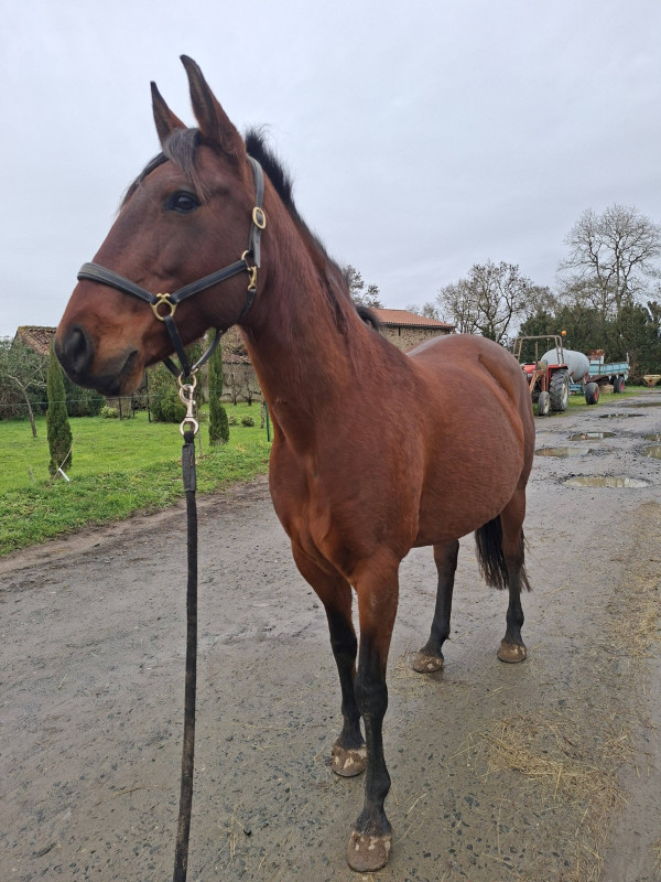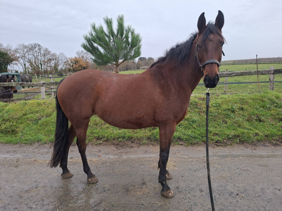Jument très attachante, curieuse et proche de l'homme ! Débourrée à 4 ans, peu travaillée en carrière mais se montre volontaire. Sort en balade régulièrement, très sympa mais a besoin de prendre confiance en elle. Vit au pré à l'année.