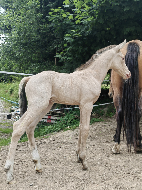 Né le 28 mai 2025, ce magnifique poulain RBP pleins papiers réunit toutes les qualités recherchées : un mental en or, une morphologie harmonieuse, et une rareté de robe exceptionnelle – isabelle champagne, lumineuse et élégante.?