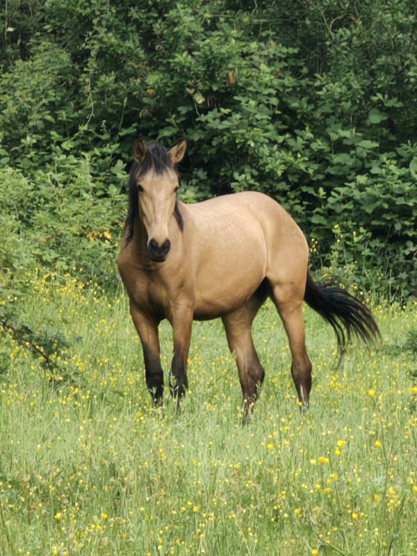 Primipare, mais possiblement pleine de mon étalon homozygote champagne, elle produirait un poulain ou une pouliche RBP en pleins papiers, sa mère et l'étalon étant déjà inscrits dans ce studbook en tant que reproducteurs.