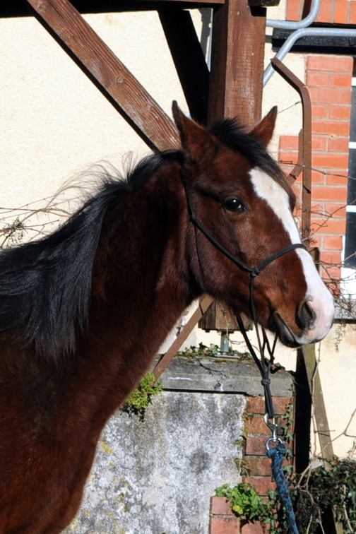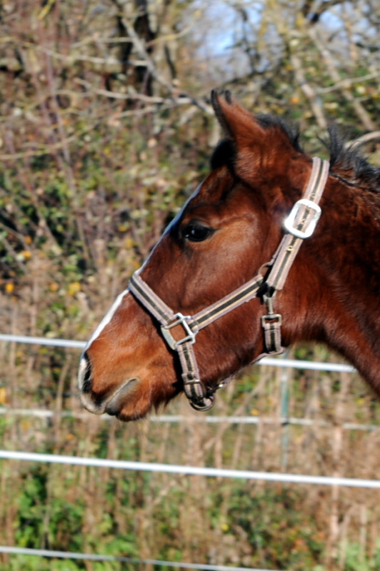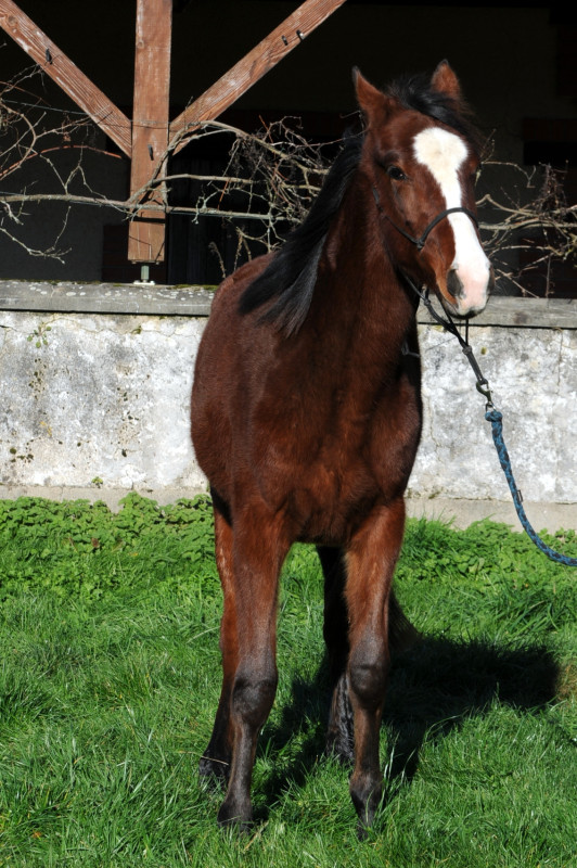 Opale est une très jolie pouliche. Elle est élancée et bien orientée. Il faudra vous projeter pour la voir "finie" mais cela va être une beauté ! Et elle a, cerise sur le gâteau, un œil parti color bleu (une rareté pour la race!) !