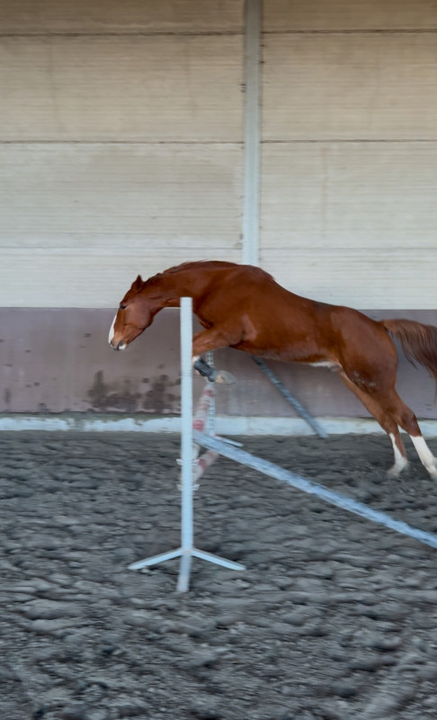 Jeune cheval sans peur, passe partout, très sympa dans sa tête. Le protocole vaccinal a été reprit, vermifuge et maréchal à jour (pas d’essai monté possible il n’aura que 3 ans en avril) il a néanmoins été débourré monté et attelé lors des entraînements de couse