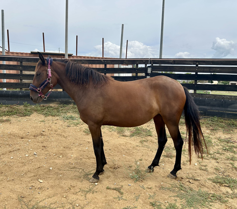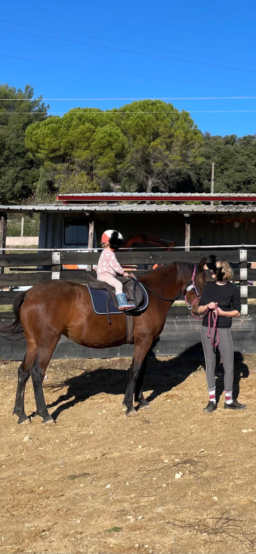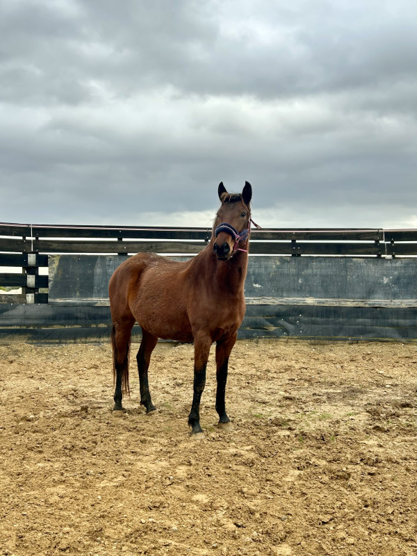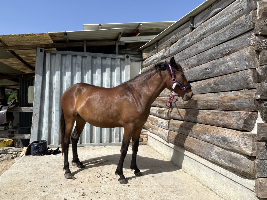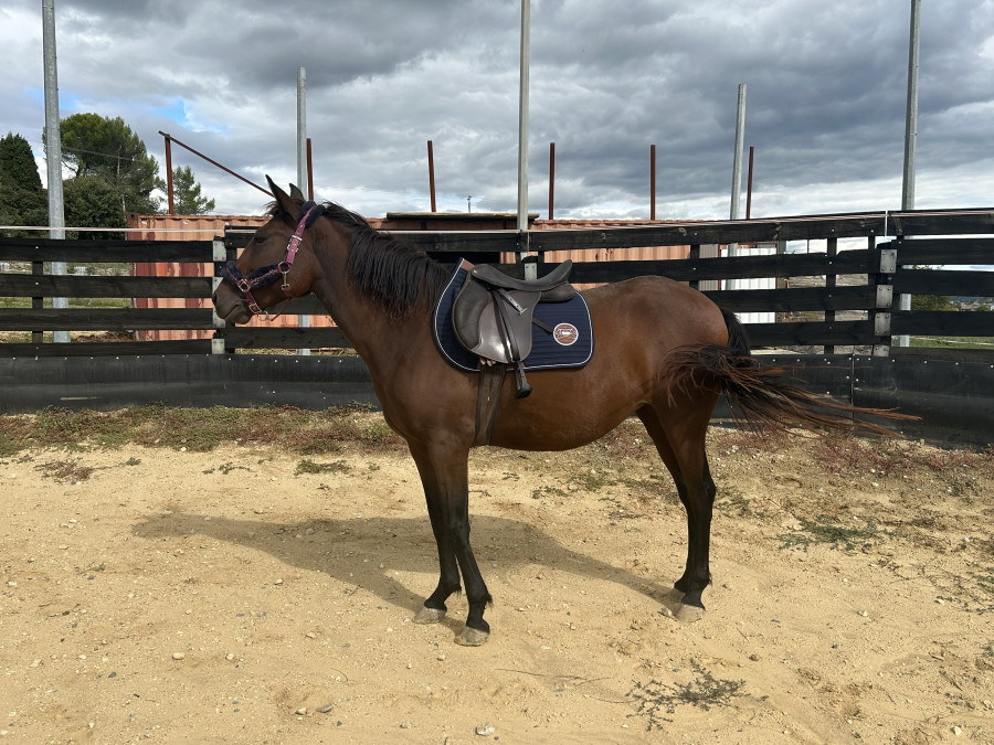 Petite jument baie ONC origine portugaise (parents portugais) de 1m55, elle prend 4 ans en 2026