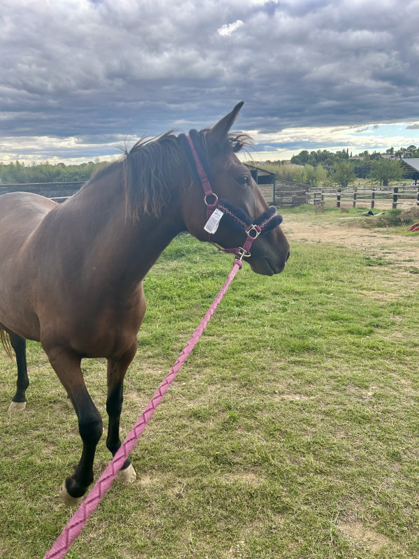 Jument en cours de débourrage, porte un cavalier en longe à ce stade, tarif évolutif en fonction de l’avancée du travail.
