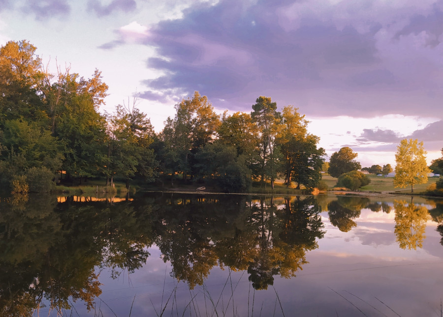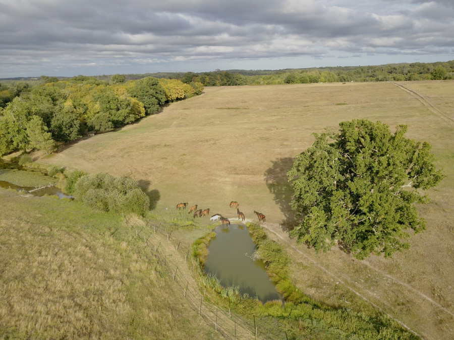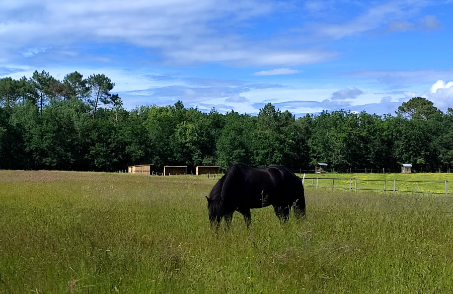 Pâtures en équipistes , avec abris en bois et naturels, accès à un grand étang d'un hectare ( baignade possible), râteliers à foin ( en nombre!) au sein d'un groupe de chevaux d'âges différents.