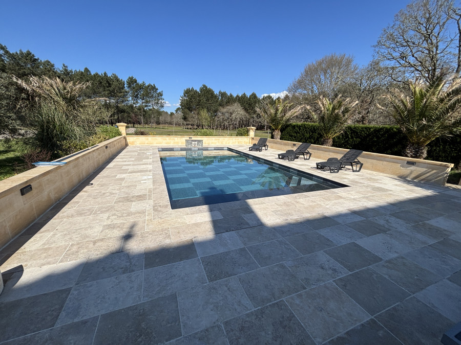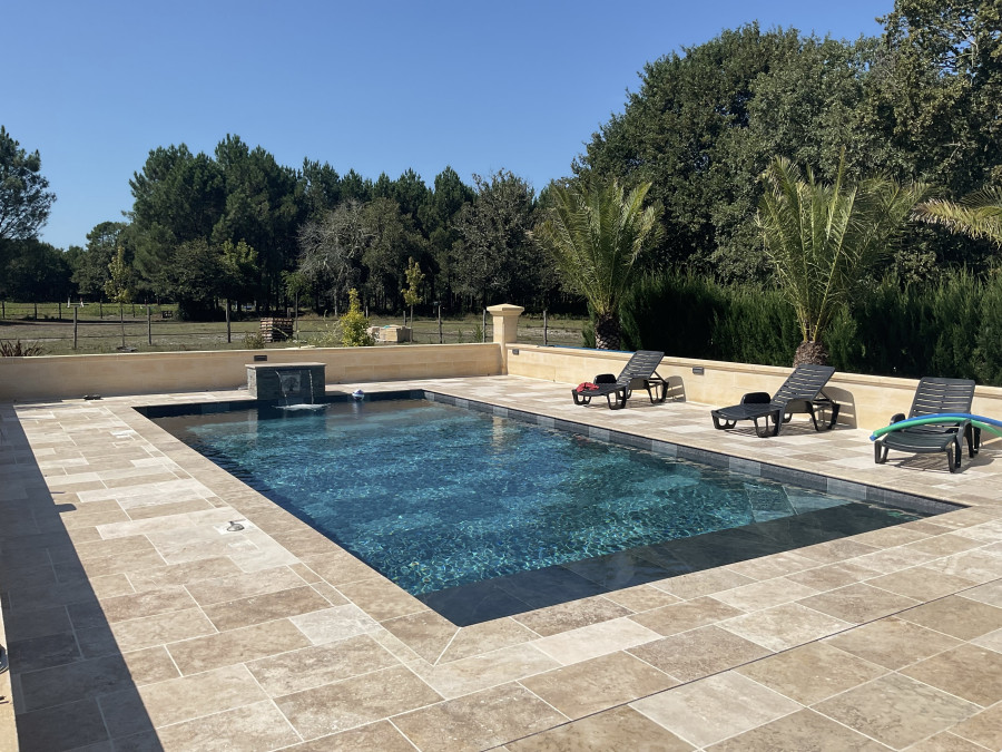 Une piscine traitement au sel de 11 m X 5 m chauffée, volet roulant automatique + une cascade, grande terrasse en pierres naturelles