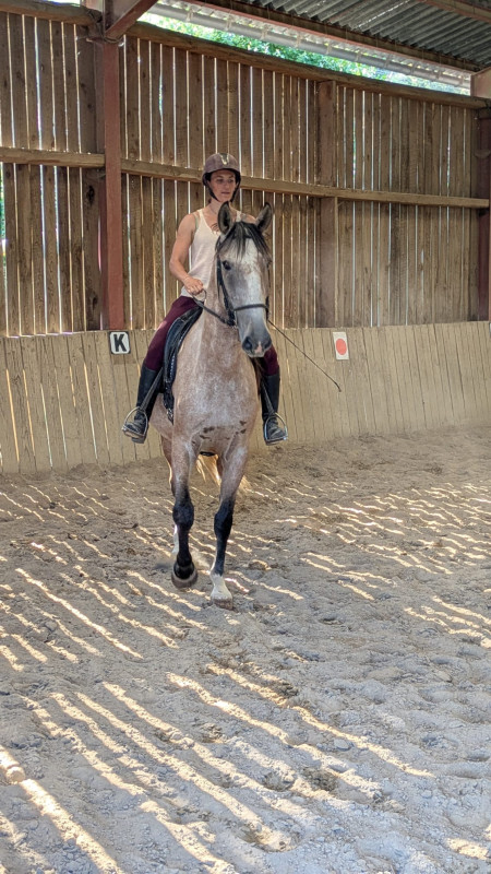 Il a acquis la session à la jambe et l'épaule en dedans au pas et au trot.