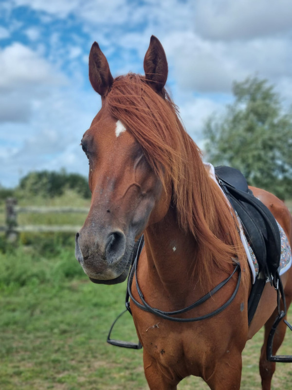 Elle a 15 ans, c'est une jument adorable aux soins, s'entend bien avec tous les chevaux, respecte les clotures même sans electricité.