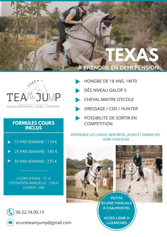 L'association Team Jump vous propose plusieurs équidés à prendre en demi pension (1 à 3 fois par semaine) !