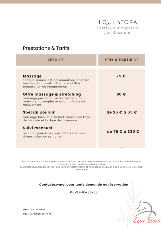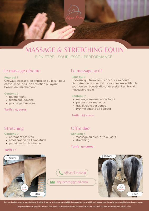 •Massage personnalisé – je choisis le type et l’intensité selon les besoins du cheval pour un bien-être optimal.