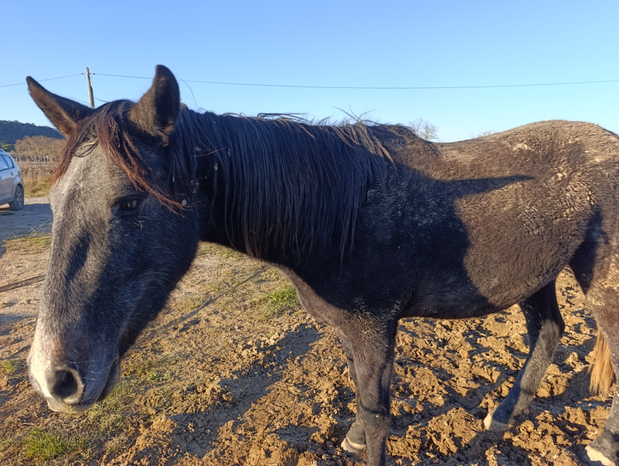 Mistral est un hongre gris ONC qui aura 4 ans en juin. Il mesure 1m50. C'est un cheval très proche de l'homme, câlin, gentil et calme. Une vraie perle ! Il vit en groupe, au pré et est pieds nus.