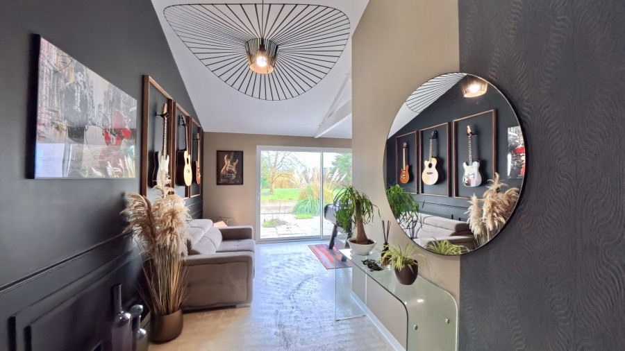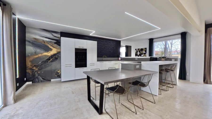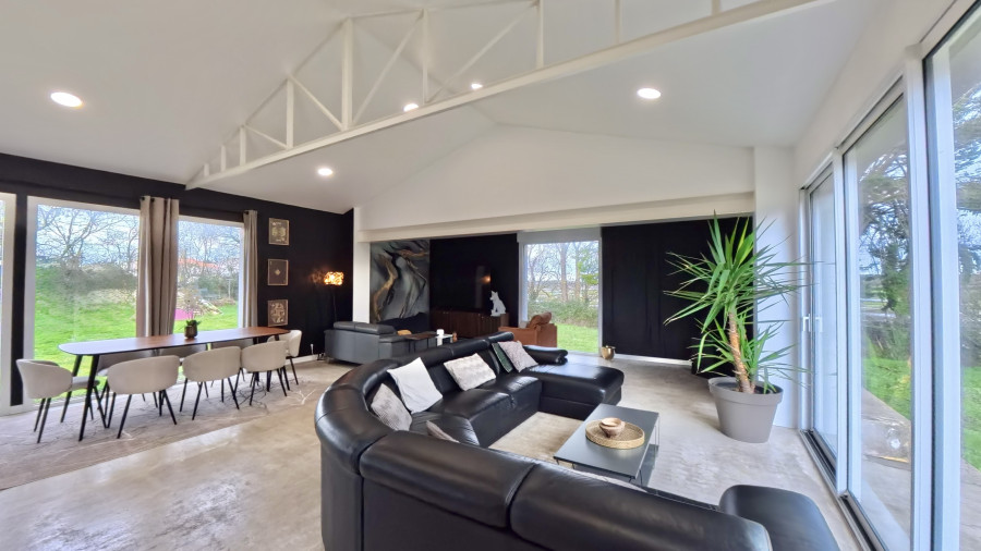 La maison principale n’est pas en reste. Dès l’entrée, un hall de plus de 30 m² annonce des volumes généreux, baignés de lumière. La pièce de vie de plus de 80 m², incluant 27 m² de cuisine ouverte entièrement équipée, offre un espace convivial et élégant, sublimé par un sol en béton ciré et un poêle à granulés.