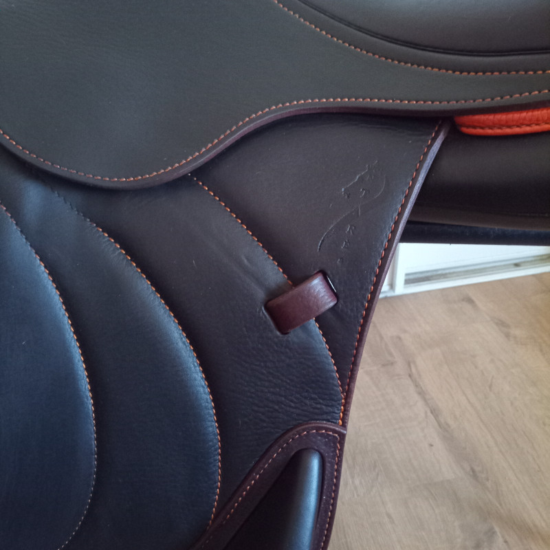 Selle d'obstacle (CSO) mono quartier en cuir havane surpiqûres et liseré orange.