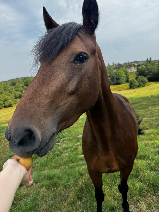 Respecte le cavalier en main et monté. Ne fuit pas à l'approche dans le pré.