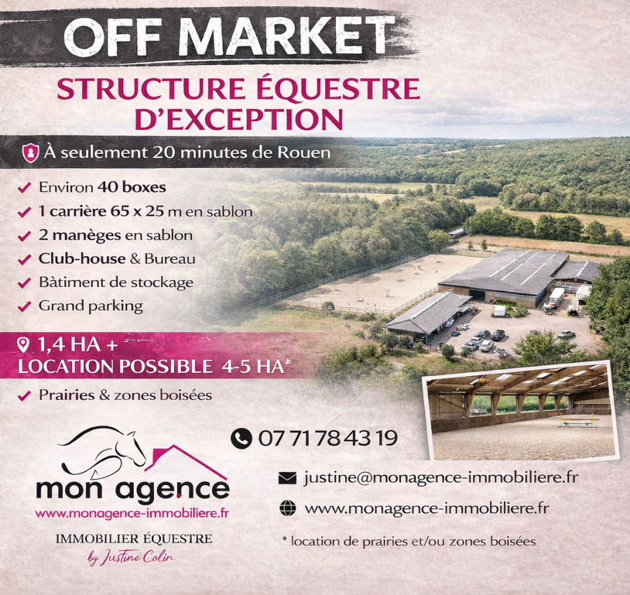 Dans un environnement calme et accessible, ensemble équestre comprenant plus de 2 300 m² de bâtiments répartis sur 8 constructions fonctionnelles.