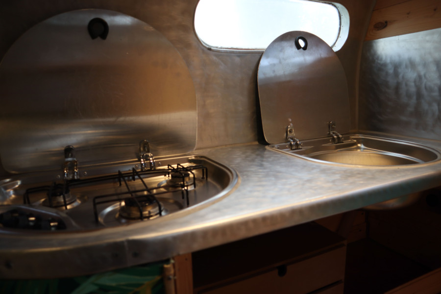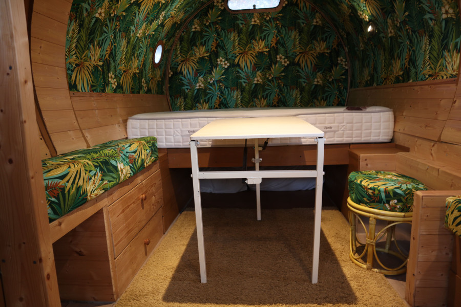 L’intérieur, chaleureux et fonctionnel, comprend un lit 140, un espace table, et cuisine avec une plaque à gaz avec bouteille, un emplacement pour douche et évier (sans eau),
